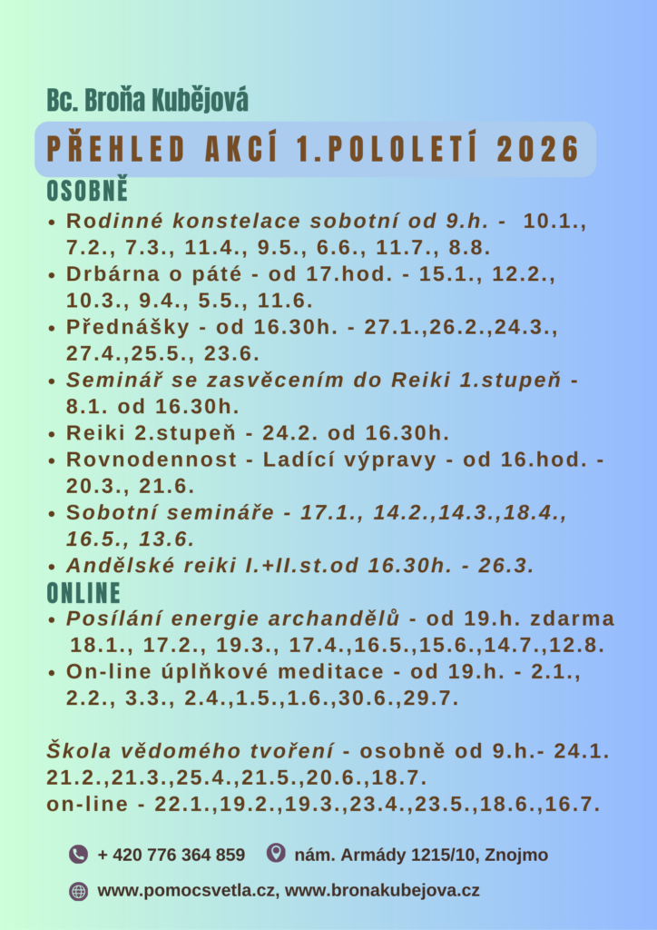 Ahoj Broni, chci Ti poděkovat za úžasný transformační víkend, plný skvělých zážitků v nádherné přírodě a se skvělými lidmi okolo. Nabíjení energie a meditace u potůčku na sluníčku bych vůbec nečekala jak bude fungovat, že všichni budem vysmátí plni elánu…🧘♀️🌞To byl príma nápad, ani auta co jeli kolem nám nevadili že pokukovali. Udělali jsme i pár skvělých foteček, malování mě potěšilo i mandalku jsem si dala na stůl a dívám se na ní každý den, pst nejde přehlédnout(je krásně barevná). Seznámila jsem se tam i se supr holkama s kterými máme společné koníčky plánujeme i výlety a jsme stále v kontaktu. Díky konstalacím jsme vyřešili hodně problémů i trápení v životech, udělali jsme vélký posun vpřed. Bylo tam parádní ubytování a boží obsluha, věřím že se tam budem všichni rádi vracet a hlavně tam vařili úplně bohovsky ani nebyl problem vegetariani i celiaci. Jsem šťastná, že jsem tam mohla být i přes mnohé překážky a děkuji Andělům, že mi pomáhají na mé cestě 😇❤️🌞